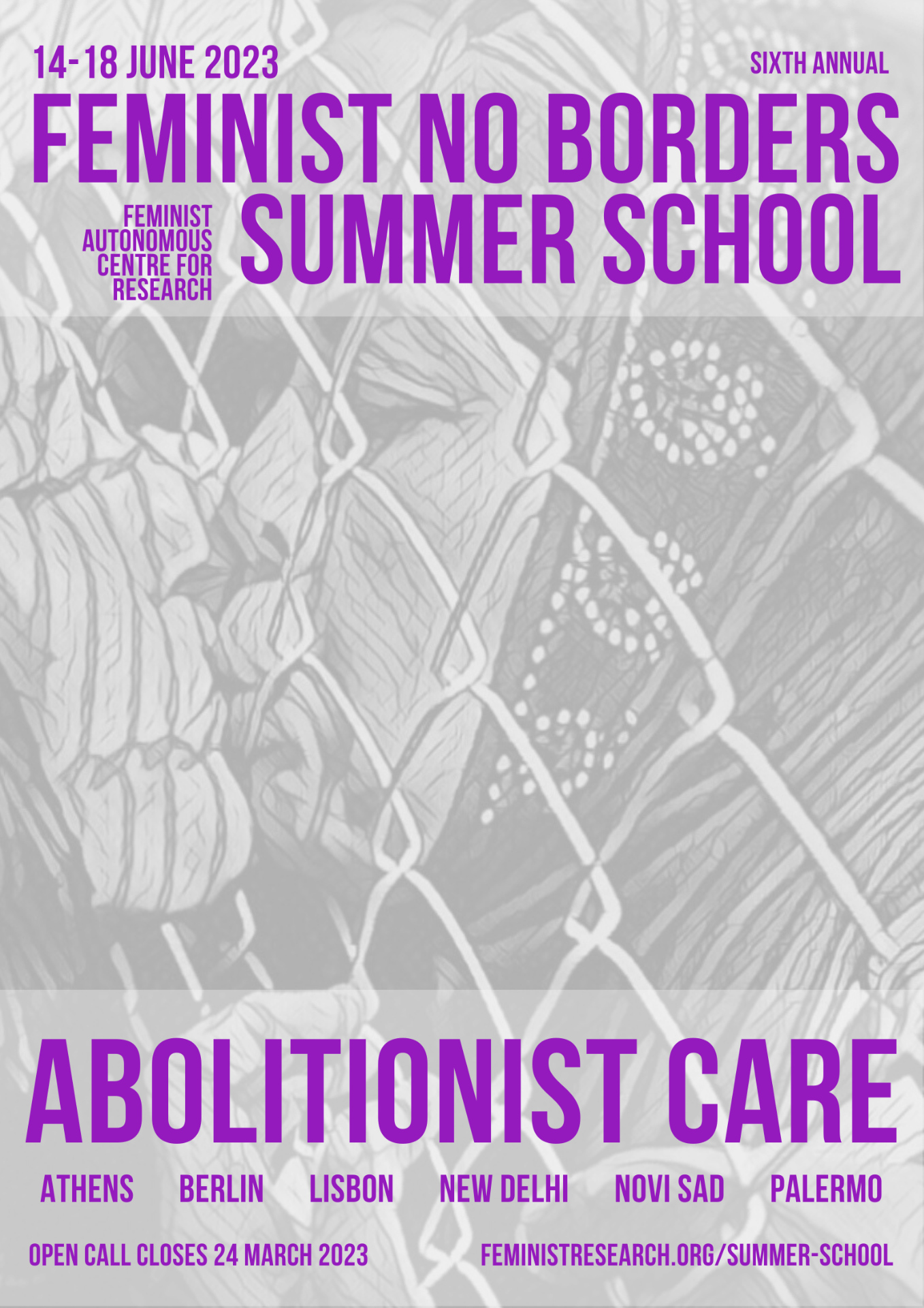 Feminist no border struggles have to imagine radical relationships of care that do not depend on the state. This year at the Feminist No Borders Summer School, we focus on abolitionist care. We propose abolitionist care as a starting point of reflection on feminist practices of resistance in the context of current anti-carceral and no borders struggles. Abolitionist care is a form of collective care that seeks to prefigure and enact a world without borders, prisons, and carceral logics. Abolitionist care is a political response to the privatisation and deprivation of care, health, food, and housing. It picks up on the transfeminist and queer inheritances of the Feminist Strike.